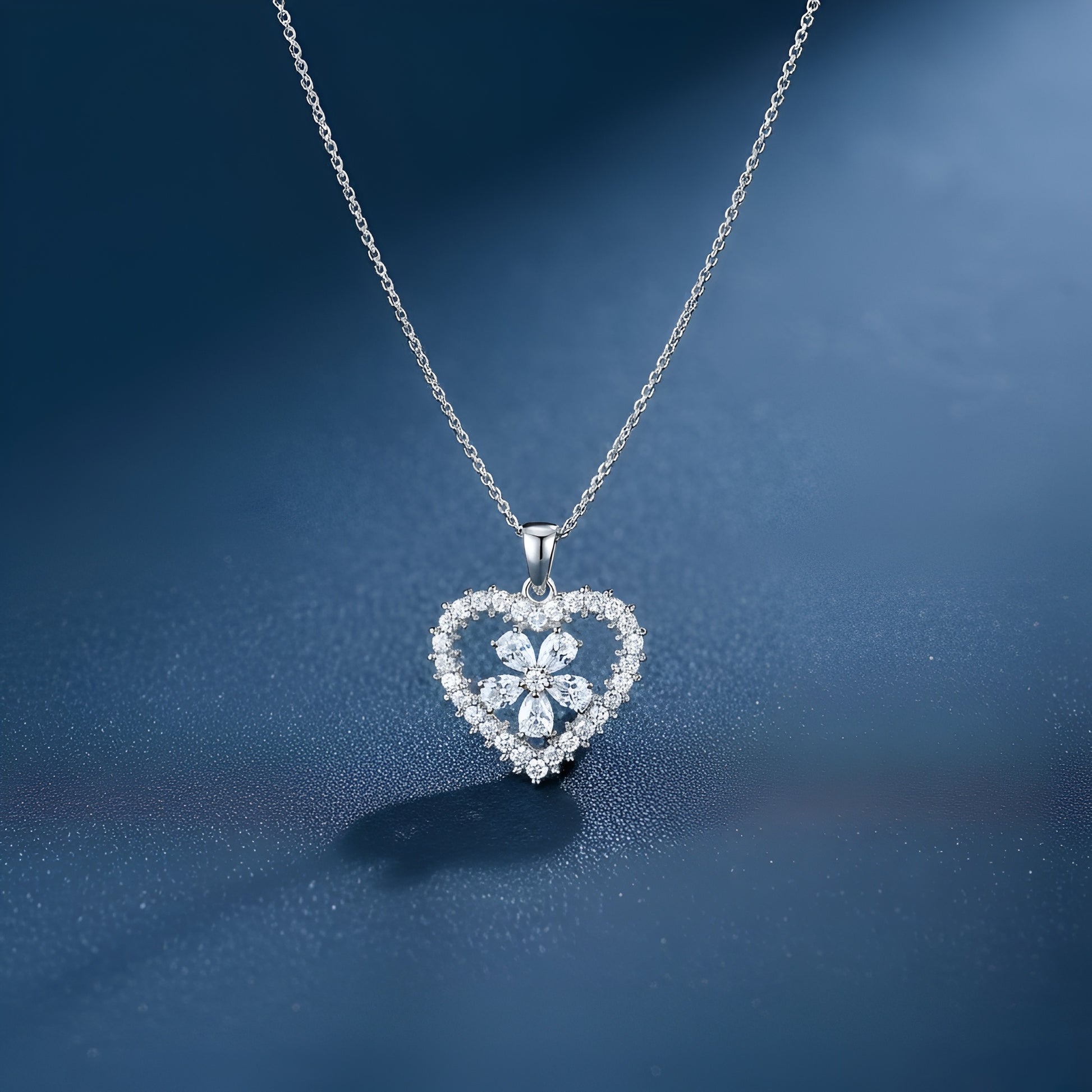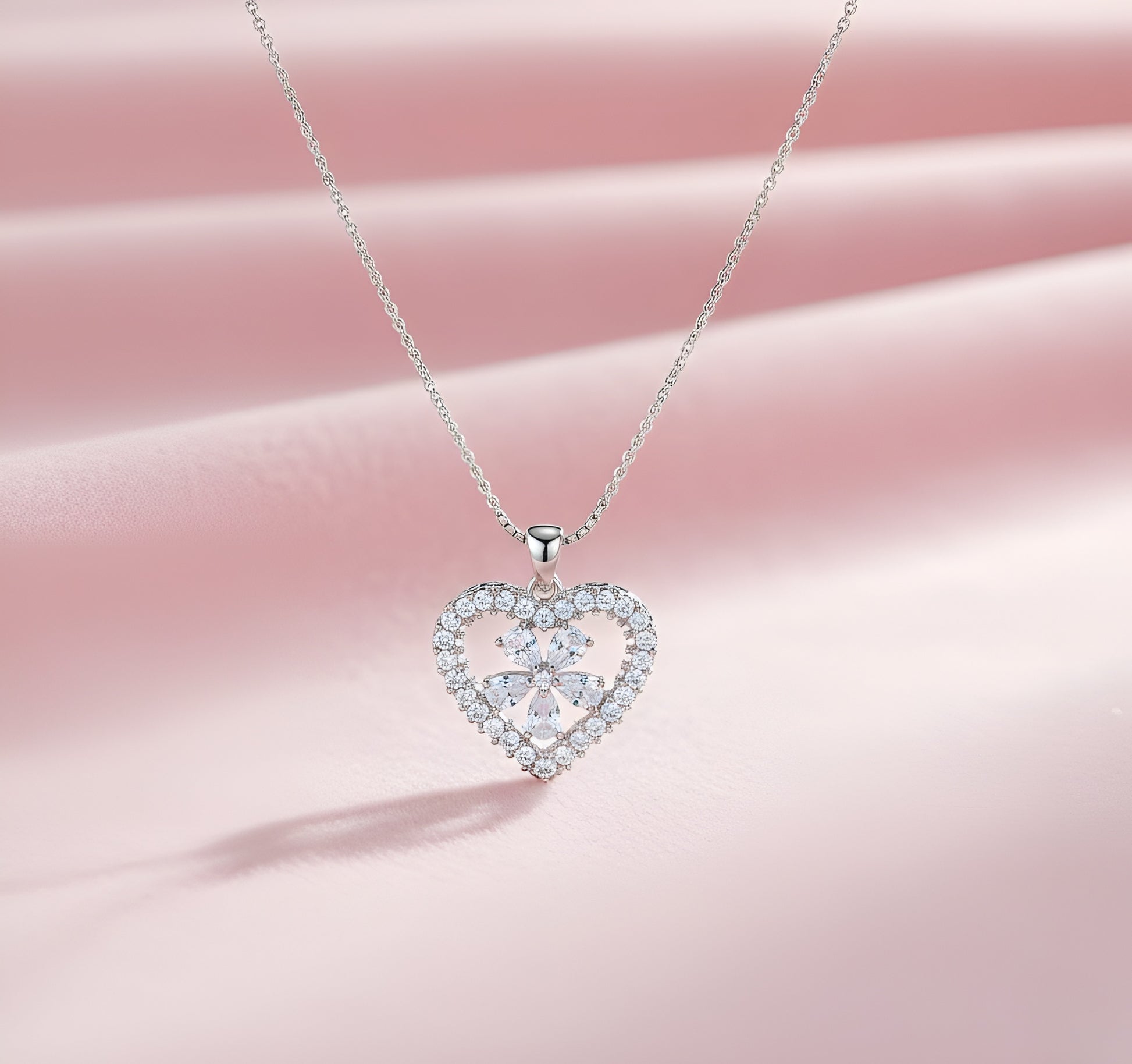 - The clear zirconia stones beautifully capture and reflect light, accentuating the radiant charm of the heart pendant and the delicate floral details on the studs.