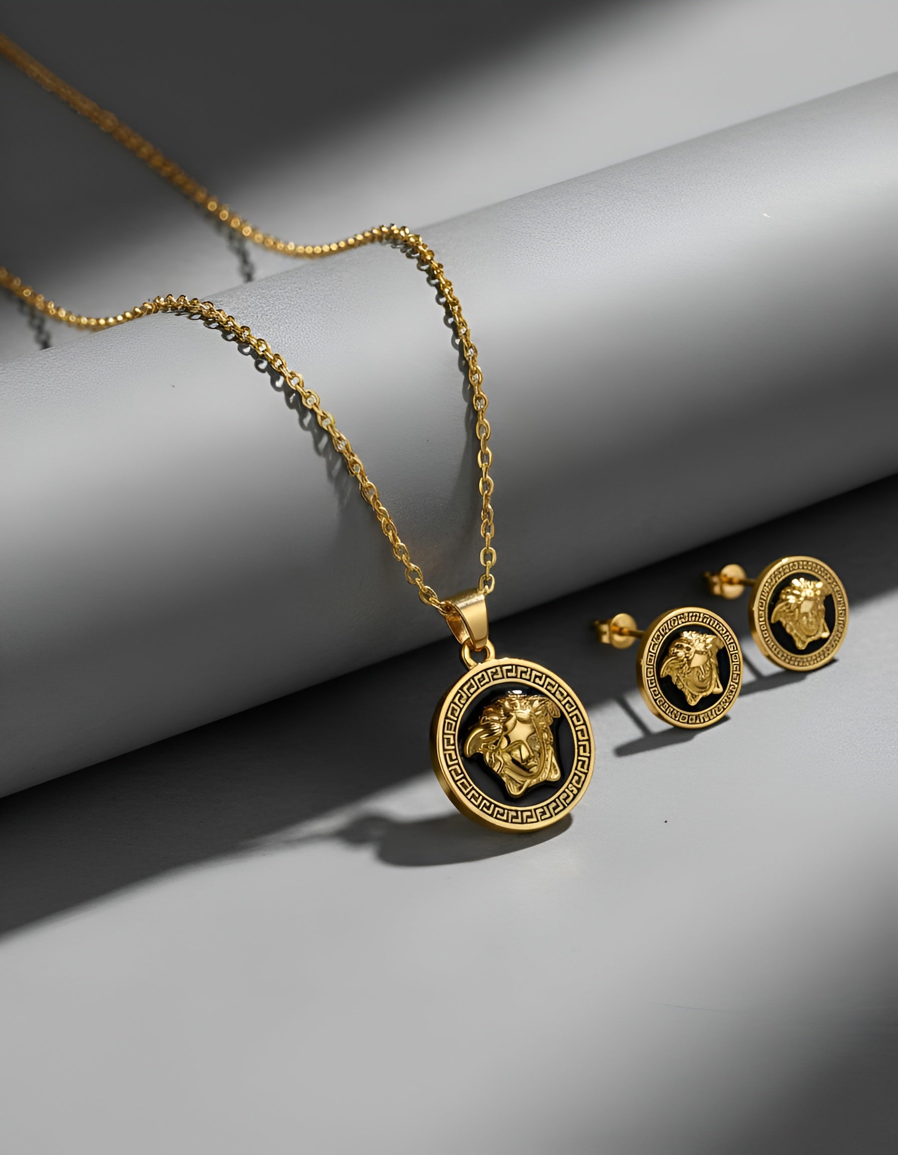 Stainless Steel Gold Plated Verse Black Pendant and Studs